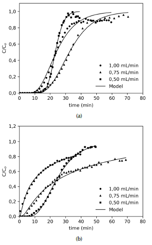 On the other hand, Figure 8 shows that increasing the feed flow rate leads to a steeper breakthrough curve, since contact time between solution and solid is too short, resulting in a reduction in the breakthrough time. In this case, the solute has not enough time to interact with the surface of the adsorbent and diffuse into the pores, particularly with large molecules such as those of organic compounds, thus adsorption is limited (Cabrera-Lafaurie, Roman, and Hernández-Maldonado, 2015). This behavior is more evident in the CXM sample (Figure 8b) than in the CX sample (Figure 8a), which could also be explained by the TiO2 blocking active sites.