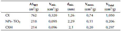 Since carbon xerogels are mesoporous materials, Table 1 shows values about texture and porous structure of the carbonaceous materials considered in this study. Values of SBET and porous parameters are higher than those obtained by Álvarez et al. (2015) for carbon xerogels, which could be due to the physical activation of the material. However, the surface area is similar to the one found for activated carbons, that is, between 824 and 1 237 m2/g (Paez et al., 2012). Likewise, the surface area for TiO2 nanoparticles agrees with those reported in literature of 116-586 m2/g (Bailón-García et al., 2017; Zhou, Zhang, and Liu, 2012). Additionally, the lower SBET for the modified materials is attributed to the presence of TiO2 nanoparticles, since microporosity is mainly associated with the carbon phase (Bailon-Garcia et al., 2017).