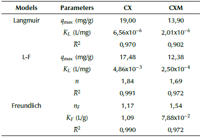 Table 2 shows the fitting parameters of the Langmuir, Freundlich and Langmuir-Freundlich models (Equations 3-5) to experimental data. According to the correlation coefficient R2, the adsorption of ASA onto CX and CXM is better fitted by the Langmuir-Freundlich model. This type of isotherm considers the heterogeneity of the solid surface, and is one of the models that best represents the removal of emerging contaminants (Álvarez et al., 2015).