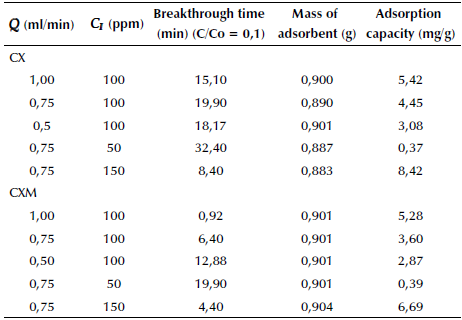 Table 3 summarizes the experimental results for break-throughtime and adsorption capacity of the microcolumns, as calculated from Equation 7. The adsorption capacity was compared with the results obtained from the adsorption isotherms, qmax. A significant decrease can be observed in < z the amount of ASA retained by the xerogels. This can be explained by the fact that during the batch experiments, the CX and CXM samples had more contact time with the ASA solution, in addition to the constant stirring. This favored the interaction with the active sites and enhanced the mass transfer rate.