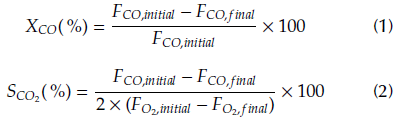 The CO conversion (Xco) and selectivity to CO2 (SCO2) were calculated using Equation (1) and Equation (2), respectively.