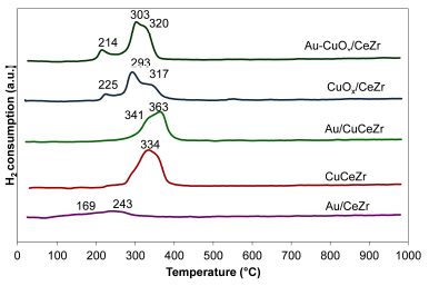 The Au/CeZr reduction pattern shows two hydrogen consumption peaks around 170 and 240 °C, which are related to the reduction of Au3+ species, promoting slightly the H2 spillover phenomenon and therefore the cerium reduction at lower temperature (Fonseca et al., 2012; Laguna et al., 2014).