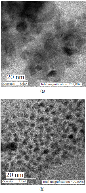 The SEM results show that the catalyst Au- CuOx /CeZr presented smaller particles formation on the larger particles of the material, while the Au/CuCeZr did not generate this type of particle. The formation of smaller particles can be attributed to the presence of CuOx on the bimetallic catalyst with impregnated copper (Au- CuOx /CeZr). Figure 3 presents the TEM results of the bimetallic catalysts.