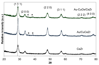 However, diffraction peaks 35,5° and 38,7° correspond to the cluster of copper oxide, such as tenorite (Moretti et al., 2015). These CuO signals were present in the bimetallic catalyst with impregnated copper (Au- CuOx /CeZr) and in the bimetallic catalyst with incorporated copper (Au/CuCeZr), discarding the formation of the solid solution Au-Cu (Laguna et al., 2014).