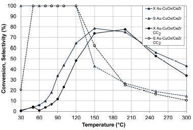 Figure 6 presents the CO conversion and selectivity to CO2 of the Au-CuOx/CeZr with respect to the monometallic catalyst of gold (Au/CeZr) and impregnated copper (CuOx/CeZr).