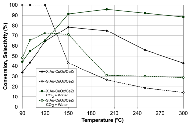 Figure 8 presents the results of CO conversion and selectivity to CO2 of Au- CuOx /CeZr, evaluating the effect of water and CO2 addition in the feed stream.