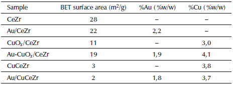 It is evident that incorporated copper samples showed the lowest specific area, and that mono and bimetallic samples present a lower surface area than support materials. The inclusion of copper ions in Cerium-Zirconium mixed oxides modifies the crystalline structure and the presence of Au, CuOx and Au-CuOx facilitates the obstruction of the smaller porous, which results in a lower surface area compared with the supports (Gurbani et al., 2009).