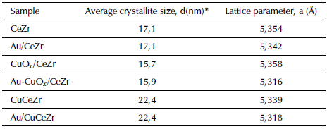Table 2 presents the average crystallite size and the lattice parameter (a) from XRD peak positions and indexation. The bimetallic catalysts did not present changes in the fluorite cubic crystalline structure when gold and copper are added. The position of peaks in both bimetallic catalysts shifted slightly toward high angles with respect to the support, which is in accordance with the decrease in the lattice parameter of bimetallic catalysts due to a possible interaction between the copper and the fluorite CeZr structure. This is not due to an insertion of copper in the crystalline structure forming a true solid solution, but to a high copper dispersion into the mixed oxides solution (Marban and Fuertes 2005).