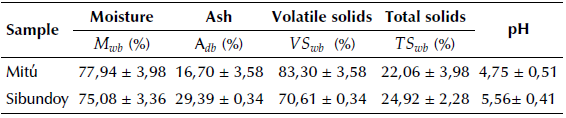 Subsequently, homogeneous samples were characterized to determine pH, moisture percentages (% MWB), ash (% ADB), volatile solids (% VSDB) and total solids (% TSDB), following the biomass characterization standards established by the National Renewable Energy Laboratory (NREL) of the United States of America. Specifically, NREL/TP-510-42621:2008 and NREL/TP-510-42622:2008 standards were used to determine the percentage of moisture and ash, respectively. According to the values obtained, the percentages of volatile and total solids were estimated (NREL, 2019). The pH of the initial sample was also determined.
