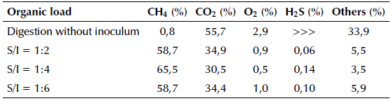 The compositions of methane, carbon dioxide, oxygen and hydrogen sulfide were determined using the 5 000®BIOGAS equipment. The samples were collected in hermetic bags in maximum periods of one to three test days for reading.