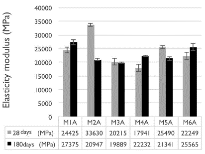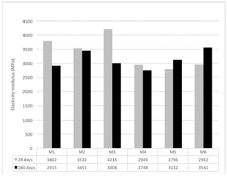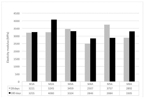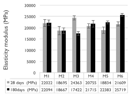 Modulus of elasticity: The procedure followed to evaluate this property was as specified in the ASTM C469 standard (2014). Figure 10 shows the average moduli of elasticity for the samples preserved in the room with controlled humidity and temperature.