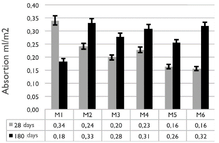 For the ISAT, data were taken after 10, 30 and 60 minutes per sample, according to the aforementioned standard. Results are presented after 10 minutes, because the trend observed at that time was constant for the rest of the measurement. However, for the following reading time values, the absorption values were lower due to the corresponding pore saturation.