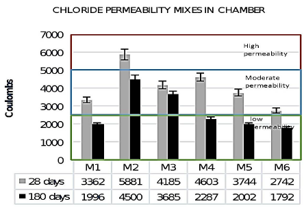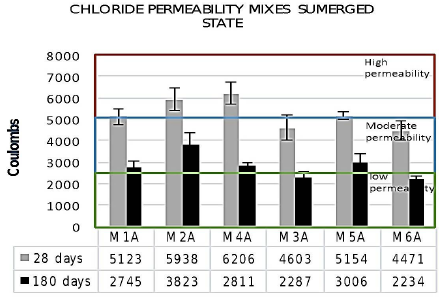 Except for the internally cured sample 2 (M2), all the mixtures recorded a moderate and low passage, thus indicating an acceptable chloride migration. At the age of 180 days, a transcendental reduction occurred in the passage of Coulombs, changing the categorization of moderate to low in all the evaluated mixtures, which agrees with what was found by Dayalan and Buellah (2014).