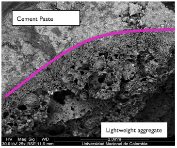 In Figure 18 and Figure 19, the interaction between the aggregate and the cement paste can be observed. There is a noticeable change of tone between the cement paste and the lightweight aggregate. It can be concluded that the darkest shade is the superficial part of the lightweight aggregate and the clear part corresponds to the cement paste, where there are signs of perimeter humidity, which indicates the expulsion of the internal curing water.
