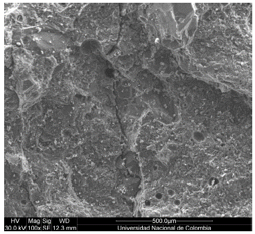 Microscopy: the main objective of this test was to observe the interaction between the aggregates and the cement paste within the concrete matrix. The microscopy test was performed in mixtures M3 and M6.