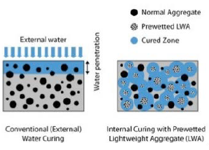 According to this, a new paradigm has arisen in response to the deficient external curing practices used in infrastructure works and, especially, facing the difficulty of curing concrete with low w/c ratio. This paradigm is called internal curing of concrete and consists in storing water inside the concrete that is not available during the mixing or in the first hydration stages but is released later for curing. In order to achieve this behavior, saturated lightweight aggregates are used, since they can provide curing water from within the mixture thanks to their absorption and desorption properties.