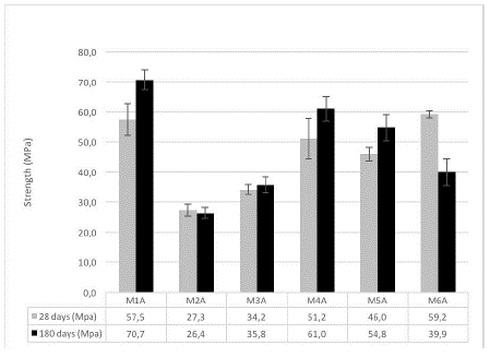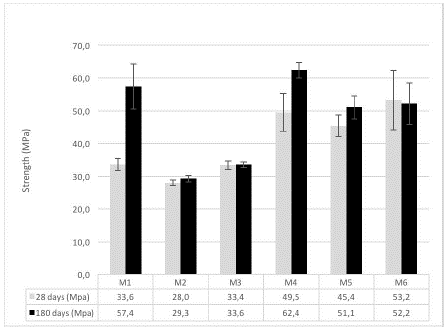 It is observed that the samples with crushed clay bricks (M2 and M3) achieved a compression resistance equivalent to 88 % of the externally cured standard mixture after 180 days. In addition, M2 and M3 presented a similar strength in the cylinders conserved in the room with controlled humidity and temperature to those preserved in the submerged state, thus proving the properties of crushed clay bricks as curating agent.