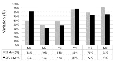 The variation of the elasticity modulus was different for all mixtures. In the case of the standard mixture in submerged state, and the samples with 25 %, replacement of the coarse aggregate by CCB in the room (M4), there was no variation in the modulus of elasticity after 180 days regarding the modulus obtained after 28 days. Meanwhile, all the other samples showed a variation between 10% and 40%, which is attributed to the difference in the composition of each mixture.