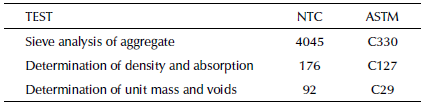 The Colombian Seismic Resistant Code (NSR-10), in its title C, defines lightweight concrete as concrete with lightweight aggregate, that has an equilibrium density between 1 440 and 1 840 kg/m3 (AIS, 2010), as defined also by the NTC 4022 (ICONTEC, 1994) based on the ASTM C567. Likewise, the Colombian technical standard NTC 4045 provides the characteristics that a lightweight aggregate must fulfill to be part of structural concrete (ICONTEC, 1997), based on the American specification ASTM C641.