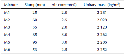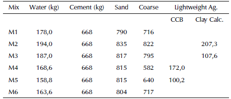 As observed in Table 5, the unit mass decreased from Mixture 2 to Mixture 6 in around 1 % and 12%, compared with Mixture 1. This is due to the lower density of the lightweight aggregates used in the mixes compared with the standard one. In large volumes of concrete, this would represent a considerable weight reduction. However, our mixes could not be considered lightweight concrete according to the definition given before. The air content has not appreciable alteration due to the use of lightweight aggregates.