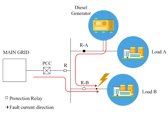 At the occurrence of a fault at any point of the system, DG protections may act if current contribution of the unit is high enough, in spite of the faulty zone being located in another neighboring feeder, causing an unnecessary tripping of the unit even of the MG. This is also known as sympathetic tripping as illustrated by Figure 3, where the protective relay R-A is tripped by the DG's contribution for a fault occurred near R-B.