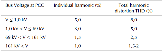 The main consequences of harmonics into the network are the high distortion levels, capacitors bank resonance and heating of electrical equipment. For these reasons, voltage and currents harmonics control requirements have to be met in accordance with the standards, IEEE 519 for example. As indicated in (IEEE, 2014), the total harmonic distortion levels (THD) allowable for some voltage ranges are defined at the measurement point.