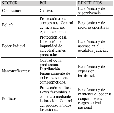 El último testimonio cita algo que ha sido sumamente interesante, pues no solo se refirió a las ganancias o roles, sino también a las visiones y motivaciones particulares que tuvo cada sector. Así, sea uno policía, campesino, político, juez, o incluso narcotraficante, el negocio del tráfico no fue únicamente un modo de satisfacción de las necesidades básicas; ha sido incluso, y principalmente, una posibilidad o herramienta de progreso social, otra característica del cluster of order (ver Tabla N°1).
