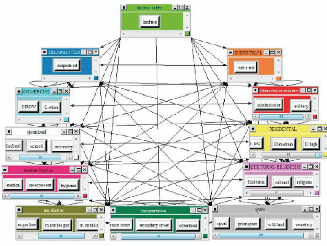 Comparison of applications in terms of safety Due to the nature of each user and its compatibility with the principles of passive defense, applications have a special value. This valuation is based on the Thomas Saaty 1 to 9.In the next step, in addition to comparing the main uses with each other, the nature of the ANP method is compared to the sub criteria of each major criterion.The value and importance of safety of some urban applications such as agricultural land, topographical effects, and urban green spaces is more than other uses, and some uses such as industrial units, gas networks and other facilities have the lowest score.In addition to evaluating the applications, according to the experts’ opinion, the significance of the nineteen-dimensional coefficients was evaluated using the AHP model and the coefficient of significance of each layer in the ArcGis environment was multiplied in the layer. According to the comparison, the layers with the highest coefficient of significance include the following: urban land use (0.19), population density (0.14), military buildings dispersion (0.115), construction density (0/088) and the distribution of urban facilities (0.068). The Euclidean method has been used to estimate the distance from the layers.Validation based on distance from the six main layers provided by these layers includes roughness’s, industries, sports fields, Red Crescent Center, health centers and green spaces. The distance obtained from the Euclidean method is obtained (the shortest distance between two points). Based on the Euclidean distance, 10 distances range from minimum to maximum.In addition to discussing the appropriateness of use and the distances from incompatible uses, the principle of lack of congestion, lack of focus and dispersion is very important. Accordingly, important administrative buildings should be distributed in such a way that the enemy with the least operational and military movements cannot cause serious damage to all buildings or the population is more exposed. So, by creating various branches, an important user can follow his or her normal life.