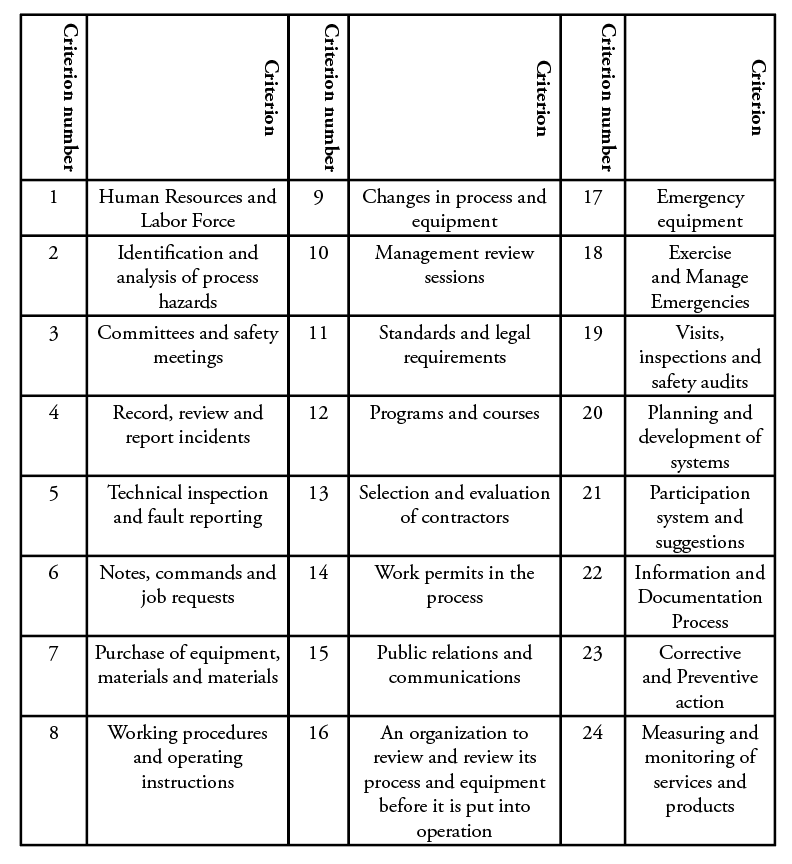 In this paper, based on the experience of the process industry, 24 criteria are considered first in Table 2. Criteria are the main activities or systematic actions that are carried out in different parts of the process industry and are in some way related to the safety of the system.