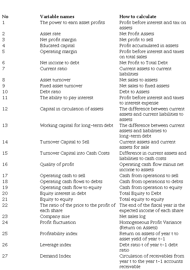 Regarding the selection of the second group (companies without financial crisis), due to the lack of restrictions on the number of companies in this group, a careful selection of companies without a financial crisis has been made.The sample of the second group is selected to be based on the stock market classification of all the industries, and according to the years 2001 onwards, proportional to the number of companies in the first group and the 60 companies that lack the features of the first group have the best financial status.The required data are selected based on the published financial statements of listed companies for each of the courses (from the financial crisis to five years before). Financial crisis data have been used to determine the financial crisis prediction model. Data from the last year to the last five years have been used to test the ability to predict the model to predict the financial crisis in companies admitted to the stock exchange.