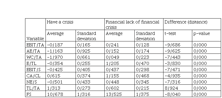 Out of the 27 initial ratios, they were recognized by using linear analysis of nine variables to predict bankruptcy. These ratios include the EBIT/TA ratio before interest and taxes, the ratio of earned earnings to assets (RE/TA), the ratio of working capital to assets (WC/TA), the ratio of equity to debt E/TL), EBIT/S), current assets / current liabilities ratio CA/CL), net profit/net sales ratio (NE/S), debt/asset ratio (TL/TA) and company size (FS). Table 2 shows the mean and standard deviation of each of the variables and their significance test for two groups of companies. As shown in Table 2, all variables were more than 99% significant. Therefore, there is a significant difference between the variables of the two groups. A significant difference between the two groups confirms the information content of accounting items to distinguish between financially and financially disadvantaged companies.