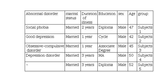 Table 1 shows the demographic Personality istics of the users. In his schema happened. The second, third, fourth, and fifth patients achieved 50%, 52%, 60% and 51%, respectively. Improvement of the first and fourth patients was more than other patients. The first-rank grades in the D-Personality represent a 50% improvement in the final session, with a significant reduction in his D Personality . The second, third and fifth patients also recovered 53%, 58%, 48% and 60% respectively. But the fourth patient achieved less improvement compared with other patients. The results of the D Personality ization in the 6-week medication adherence showed that patients achieved a clinically meaningful improvement compared to the baseline, and the improvement of the fifth patient was more than other patients. Scores treatment compliance in Table 2 indicate that the patient first, second, third, fourth and fifth respectively 50%, 75%, 40%, 50% and 66% recovery achieved and the process in 6 weeks during the fall had. Scores working memory in Table 3 show that the patient first, second, third, fourth and fifth respectively 60%, 80%, 57%, 25% and 67% recovery achieved and the process in 6 weeks during the decreasing Is. Scores of prospective memory in Table 3 show that the patient first, second, third, fourth and fifth respectively 53%, 51%, 52%, 55% and 54% recovery achieved and the process in 6 weeks during the fall had. The trends in tables 2 and 3 are shown in Figures 1, 2, 3, 4, and 5. The negative sign (-) indicates a decrease in the scores.