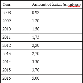 According to calculations performed by BAZNAS and IPB, based on the 2010 GDP potential of zakat in Indonesia amounted to Rp217 Trillion. With the extrapolation method, the potential of zakat in 2015 amounts to Rp280 trillion and the realization is estimated at Rp 4 trillion or less than 1.4% of its potential (Hartono, Directorate General of Taxes, 2016). Meanwhile, according to data obtained from BAZNAS, the realization of ZIS funding nationally 2008 to 2015 is shown in the following table.