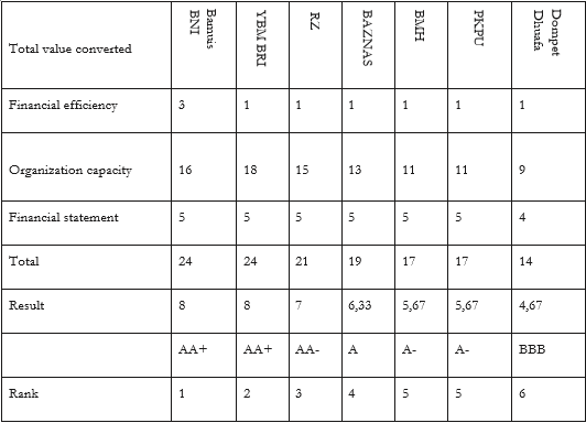 Based on the measurement of financial performance appraisal conducted on seven ZI, it can be concluded in general, ZI financial performance is considered good enough. The best ranking was obtained by BNI BNI, YBM BRI was ranked second. Then, in the third rank achieved by the RZ, then the fourth ranking achieved by BAZNAS. While the fifth ranked achieved by BMH and PKPU. Last ranked sixth was achieved by Dompet Dhuafa Republika (DDR).
