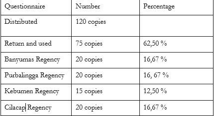 Respondents of this research are taxpayers of SME entrepreneurs in four areas, namely Banyumas, Purbalingga, Kebumen and Cilacap. The distribution of questionnaires was conducted in UMKM centers running their business. The total number of questionnaires distributed was 120 copies (each of 30 copies). The number of return questionnaires that can be used for data analysis is 75 copies coming from the four regions or 62.5 percent.