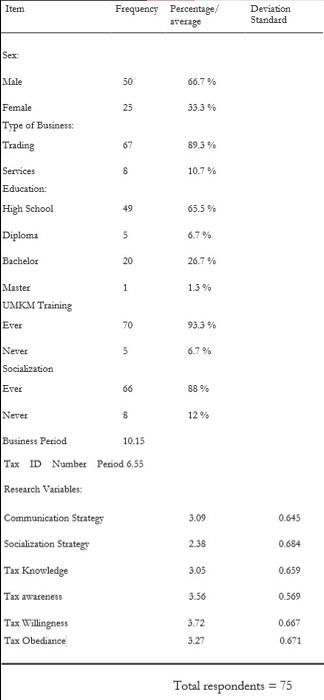 Descriptive statistics contains data characteristics obtained including the frequency or presentation of demographic factors, the mean values of each variable and the standard deviation. Table 2 shows descriptive statistics that was processed before the validity and reliability test. The highest number of respondents is male that is 50 people and the rest are women of 25 people. Respondent business type is dominated by trading that is 89.3 percent while the rest is the service sector that is 10.7 percent. Most respondent’s education is high school and bachelor degree. As many as 93.3 percent of respondents had never attended UMKM training and 88 percent had never followed the tax dissemination program. The average length of the business that have been carried out by the respondents is 10 years and holding the Tax ID Number (NPWP) for 6.5 years.