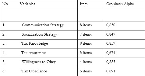 This study consists of five independent variables and one dependent variable. The independent variables consist of perceptions of the effectiveness of communication strategies (measured by 9 statement indicators) and socialization (measured by 8 statement indicators), taxpayer awareness (measured by 6 statement indicators), tax knowledge (measured by 9 statement indicators), and willingness to obey (measured by 7 statement indicators). Dependent variable used is tax compliance. Measurement of variables was done using instruments that have been done in previous research with some modifications tailored to the research setting. The scale used to measure the various variables is the Likert scale 5.