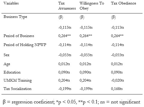 Hypothesis testing is done by using multiple regression analysis. Table 4 shows the summary of hypothesis test results to test the effect of demographic variables on the three dependent variables. The first stage of hypothesis testing is to examine the effect of demographic variables on the dependent variable consisting of tax awareness, obedience and tax compliance. The result of regression test showed that the business type had a significant negative effect on tax compliance (β=0.201; p<0.05), the length of business had a significant positive effect to the tax awareness (β= 0.264; p<0.1) and the willingness to obey (β= 0.360; p<0.05). Duration of holding NPWP has a significant positive effect on tax compliance (β= 0.269; p<0.1). The participation of tax socialization has a significant positive effect on tax compliance (β=0.245; p<0.05).