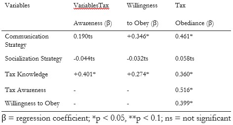 The influence among variables was tested by using multiple regression analysis. There are several steps to test the influence among these variables: first, testing the influence of demographic variables on tax compliance. Second, examining the effect of effective communication strategy, socialization strategy and tax knowledge on tax awareness. Third, examining the effect of effective communication strategies, socialization strategies and tax knowledge on willingness to obey. Fourth, testing the effect of effective communication strategy, socialization strategy and tax knowledge on tax compliance. Fifth, testing the consciousness of the taxpayer and the desire to comply with tax compliance.