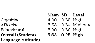Table 1 indicates that the lowest mean score in the pre-test across the language attitude constructs was from the affective construct (M=3.58, SD=0.34) which is reported to be of moderate level. Cognitive was the construct with the highest mean score (M= 4.00, SD = 0.38) and the second highest was the behavioural construct (M= 3.90, SD = 0.30). When the three constructs are accumulated leading to an overall report of the language attitude, the participants’ mean score before the intervention (M=3.83, SD=0.30) was high. It suggests that the students, as a whole, had a positive language attitude towards the English language.