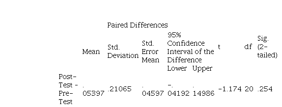 With the data from the pre- and post-test, the paired samples t-test was run to determine the mean score gain significance so as to accept or reject the null hypothesis of the study. As indicated in Table 3, the p-value (p= 0.254) for the data was p>0.05. Thus, the two-tailed paired-samples t-test suggests that the participants had no statistically significant gain score in the post-test (M=3.88, SD=0.32) than the pre-test (M=3.83, SD=0.28) and the null hypothesis that there was no difference is accepted, t(20)=-1.174, p ≥ 0.05. Upon estimation, the value of d from the data was 0.256, suggesting that the intervention led to a small effect size (Sullivan & Feinn, 2012).