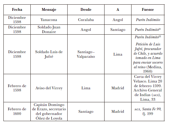 En víspera del desastre no existe una forma institucionalizada para poder despachar informaciones. Los canales eran múltiples y, por lo tanto, azarosos. El “desastre”, por tanto, circuló inorgánicamente desde la llegada de un yanacona contando “el triste caso” en Angol (Arias de Saavedra& Álvarez de Toledo, 1862, p. 25). De hecho, si observamos el mapa, se muestra cómo Angol (San Andrés de los Infantes) fue destruida en 1600. Con el infortunio de las ciudades, en su inminente destrucción, comenzó una amplia circulación de esta funesta noticia en el virreinato: la muerte del gobernador, la sublevación indígena y la “inminente pérdida” del reino. El objetivo de esta sección es seguir el movimiento de estos mensajerospara entender cómo se comunicó este “oscuro” desastre.