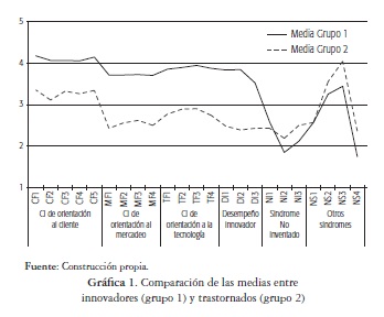 La ( Grafica 1) muestra las diferencias de calificación entre los dos grupos de análisis, y se observa una diferencia de 0,7 puntos en los CIOC (CF1 al CF5); luego la brecha diferencial se amplía en los constructos de orientación al mercado y algunos de orientación a la tecnología, con una brecha de aproximadamente 1,2 puntos en promedio, para los constructos de CIOV, (VF1 al VF4 y TF1 al TF4), existe una distancia de 1,8 veces correspondiente a un 70% por encima de los constructos del cliente. Los constructos DI1 al DI3 presentan además la brecha más alta de los anteriores, con diferencias entre el grupo Innovadores y el grupo Trastornados de hasta 1,5 puntos.