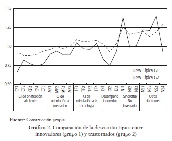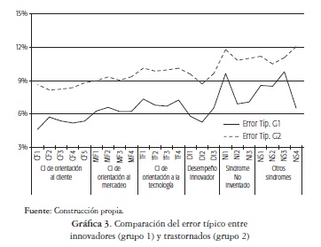 También se puede observar cómo el valor del constructo NS3, perteneciente al síndrome NSH, alcanza una desviación de 1,4 puntos, con un error cercano al 9%, lo cual indica a su vez que este constructo es el que tiene mayor grado de discusión y diferencias de criterios en el grupo Innovadores. Para el caso del grupo Trastornados, la desviación típica rodea 1,2 puntos en los NI y NS, con errores entre 11 y 12% (los más altos del estudio). Esto permite observar además que este grupo es el que presenta claras diferencias con los criterios del grupo Innovadores. Esta información será corroborada de manera estadística para evaluar la similitud entre los dos grupos.