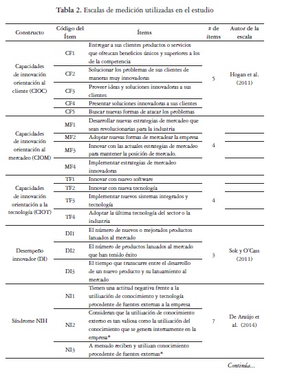 Para la medición de las variables objeto de estudio se utilizaron varias escalas, las cuales se describen en la (Tabla 2), en la que se detalla que para la CI se aplicó la escala desarrollada por Hogan, Soutar, McColl-Kennedy y Sweeney (2011); el DI estuvo bajo los parámetros de Sok y O'Cass (2011), y los síndromes NIH y NSH se soportaron en De Araújo et al. (2014).