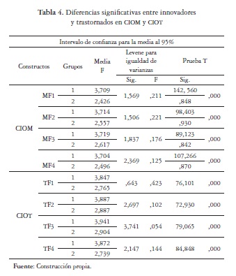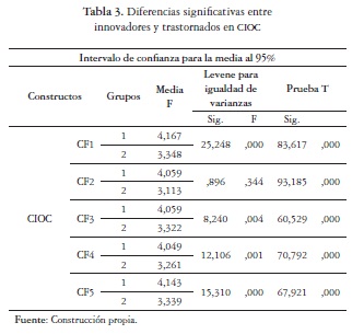 En la (Tabla 3) se recogen las diferencias en medias significativas con respecto al CIOC en las organizaciones objeto de estudio. La media indica que el CF1 para el grupo Innovadores da cuenta de un 4,167, y el grupo Trastornados en 3,348; el CF3 con un 4,059 y 3,322, para CF4 se detalla con un 4,059 y 3,261 y el CF5 se observa con un 4,143 y 3,339 de manera consecutiva. De igual forma, se observa que existe una significancia importante en los ítems entrega a sus clientes productos o servicios que ofrezcan beneficios únicos y superiores a los de la competencia; proveer ideas y soluciones innovadoras a sus clientes, presentar soluciones innovadoras a sus clientes y buscar nuevas formas de atacar los problemas.