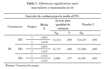 Ahora bien, la escala de medición planteada por Sok y O'cass (2011) que se utilizó en el constructo del DI detalla que los valores significativos se encuentran en el indicador DI1 y DI2 para el grupo Innovadores y Trastornados de manera consecutiva, lo que se observa en la (Tabla 5).