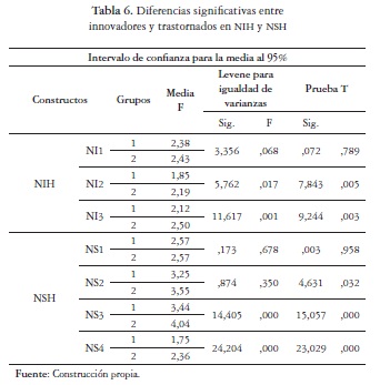 Sumado a ello, se observa que para ambos grupos, NI3 y NI2, fueron significativos con un 2,50 y 2,12; así como con un 2,19 y 1,85 respectivamente, resaltando que el orden cronológico de estos es para el grupo Trastornados e Innovadores. Sin embargo, el síndrome NSH se manifiesta una situación similar en cuanto a que el grupo Trastornados tuvo valores mayores que el grupo Innovadores, es decir que el NS3 con valores de 4,043 y 3,443 y el NS4 2,36 y 1,75, en esa misma particularidad, fueron los valores de mayor trascendencia en esta indagación.