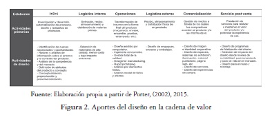 De igual forma, la gestión estratégica contemporánea desde las necesidades que impone el planteamiento de ventajas cada vez más competitivas que ayuden a rentabilizar las empresas, ha adoptado actividades de diseño en su cadena de valor para obtener ventajas de costo y de diferenciación. De lo que se deduce que en la cadena de valor, todas las etapas de proceso de diseño de productos y servicios, desde la investigación preliminar, el desarrollo de un concepto básico, la fase de diseño y desarrollo de prototipos, hasta su producción, comercialización y posventa, son reconocidas como prácticas estratégicas y operativas paralelas a las actividades primarias, que agregan valor y mejoran la competitividad de una empresa Figura 2
