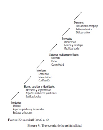 En este punto es importante referir la acertada trayectoria que Krippen-dorff (2006, p. 6) identifica para caracterizar la evolución y el alcance del diseño en un contexto global cada vez más complejo, inmaterial y público. La figura 3 identifica una progresión que inicia con el diseño de productos desde criterios de uso, funcionales y estéticos; transita a los bienes, servicios e identidades aprovechando su función en la configuración de entornos, ideas y símbolos, así como en la creación de valores desde estéticas locales y populares apreciables para un mercado; se traslada hacia el diseño de interfaces apoyando la configuración de arquitecturas de información, softwares y medios digitales cada vez más interactivos adaptables y comprensibles para los usuarios; para abordar las redes y sistemas mul-tiusuario; trasladándose al diseño de proyectos desde el intercambio de información entre contenidos de gestión y diseño que permitan conseguir soluciones creativas viables para un cliente y su contexto; hasta llegar finalmente a protagonizar espacios de reflexión teórica y de diálogo crítico.Figura 3